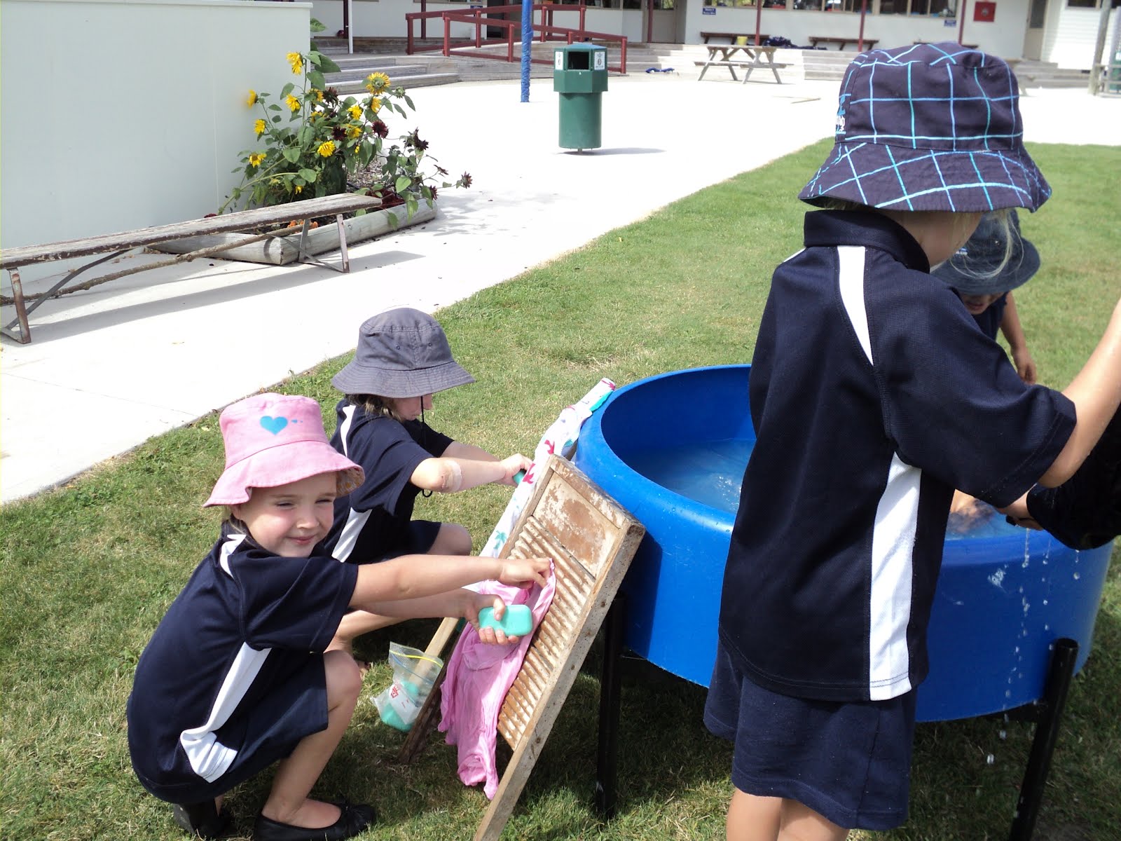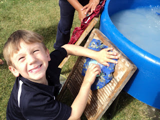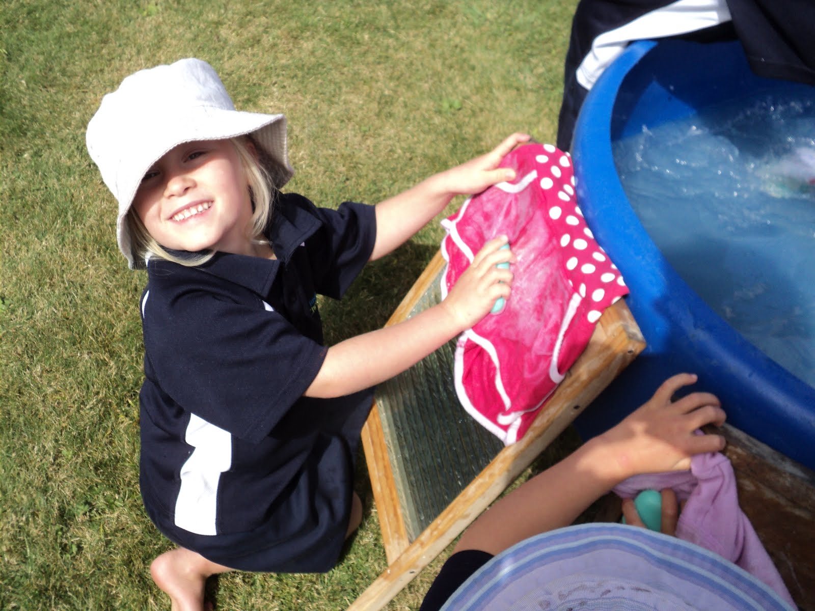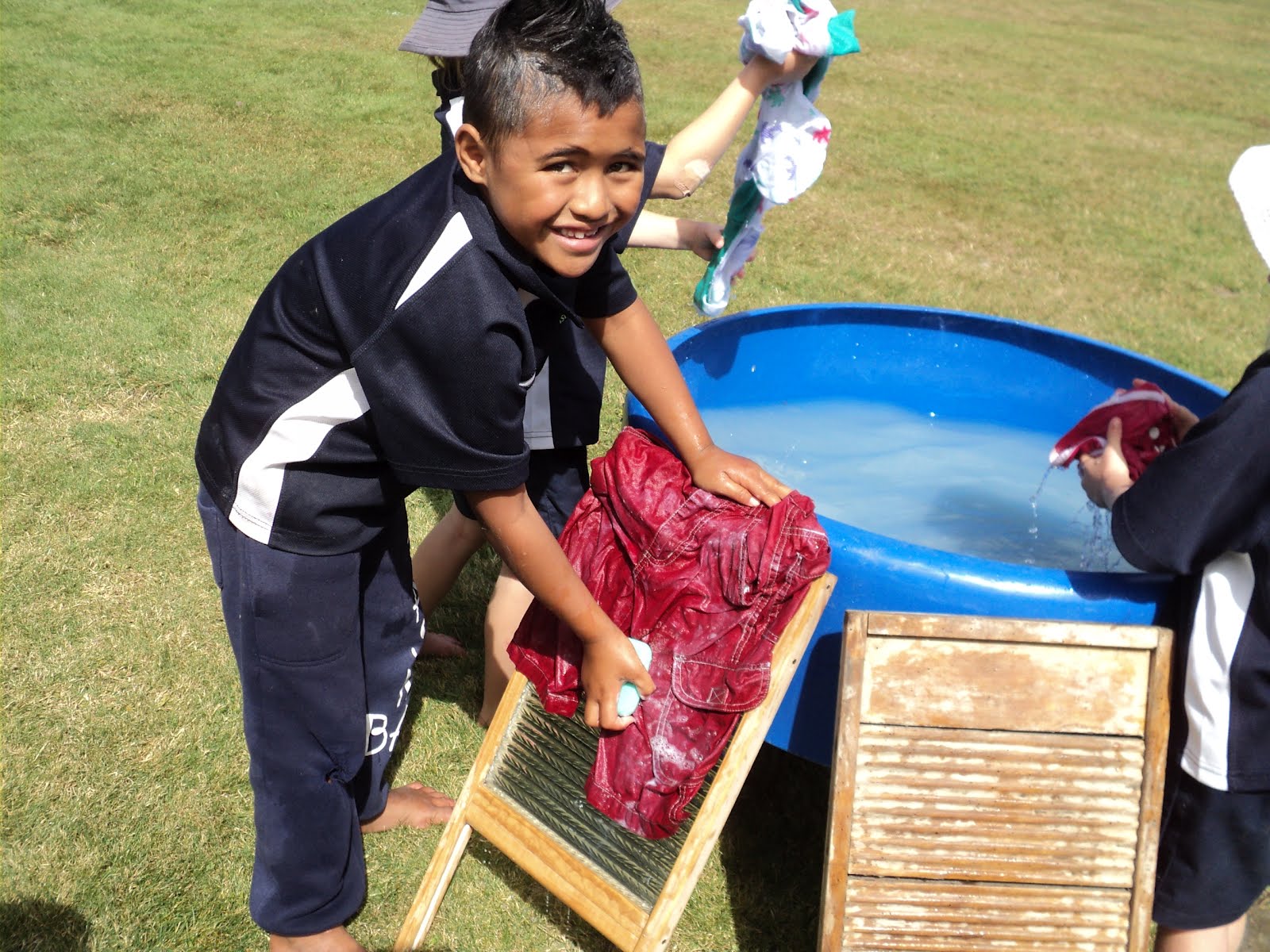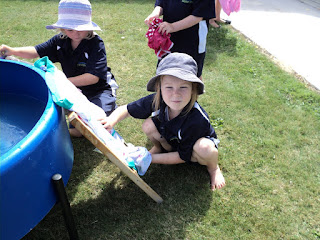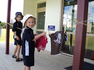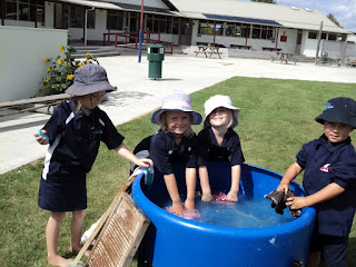 Last Tuesday Room 1 discovered what it was like to do washing in the olden days! A couple of washing boards, some soap, a tub of water, and a bit of elbow grease.... they washed a dirty item of clothing that they brought to school.