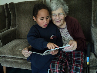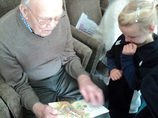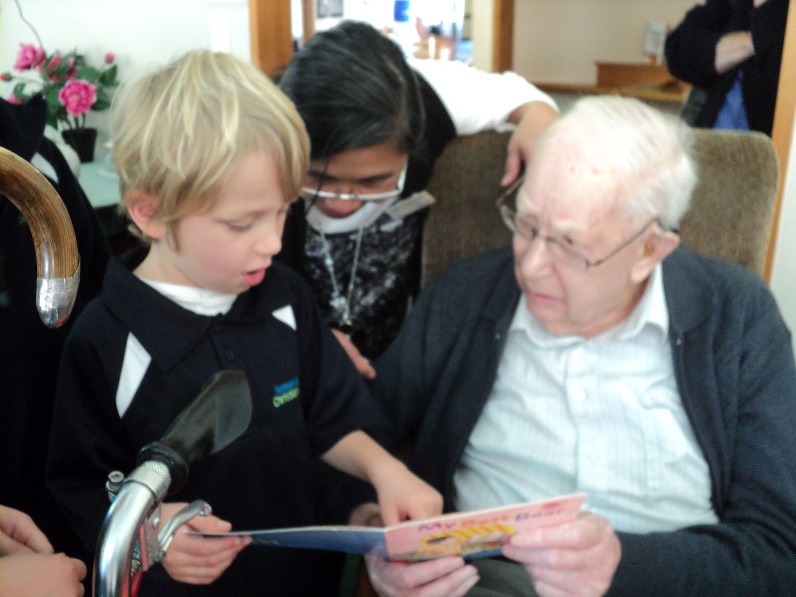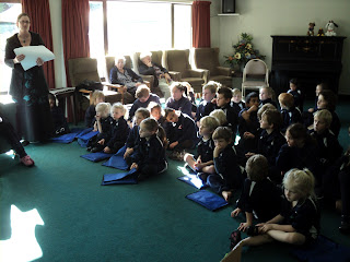 Today Room 1 and 3 went to Woodlands to visit the elderly folk there. We sang a couple of songs, Room 1 did their "Greedy Cat" skit, Miss Aldridge did a little talk about God, then we shared our autumn artwork and room 1 read some of their books to the elderly folk. The elderly folk enjoyed our visit very much and we enjoyed our trip too! Here are some photos of our visit: