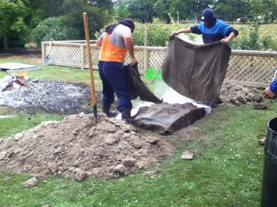 There was a fire. They put hot concrete stones in the hole. They put food into the great hole and then they covered it with dirt. Before they put the dirt on top they put wet blankets/stuff on top of the food first.