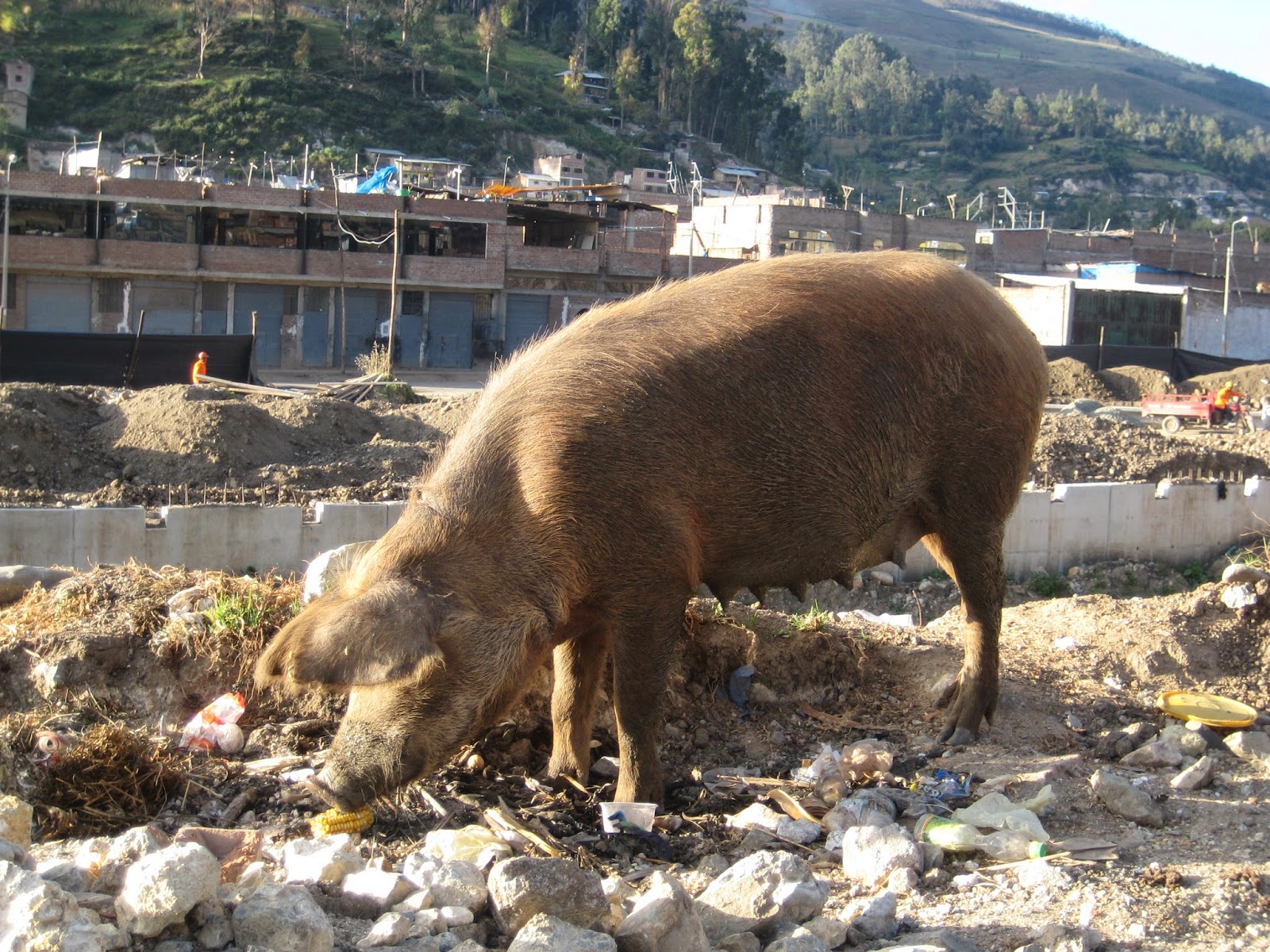 This is a pig trying to find some food in amongst all the rubbish that has been left lying around! There is lots of rubbish around. People just chuck it on the ground!