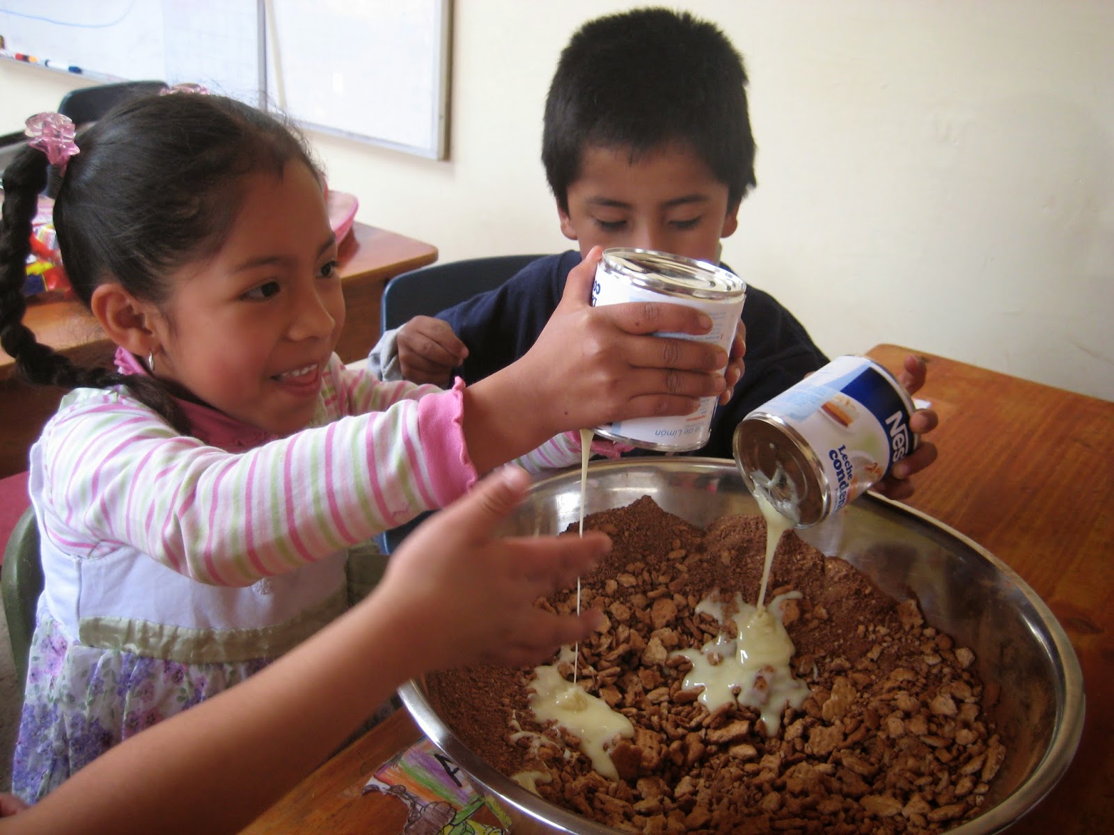 3. Pour in 1 tin of condensed milk. In this photo you can see two tins. That's because each group doubled the recipe so we would have enough!